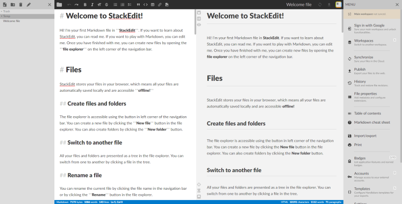 StackEdit(スタックエディット)は、ブラウザで動作するオープンソースのマークダウンエディタです。
