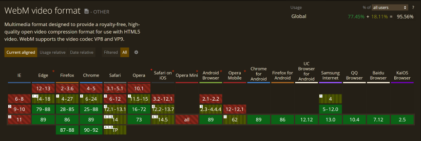この記事の執筆時点で、WebMは、IEとOperaを除く、ほぼすべてのブラウザが対応しているようです。